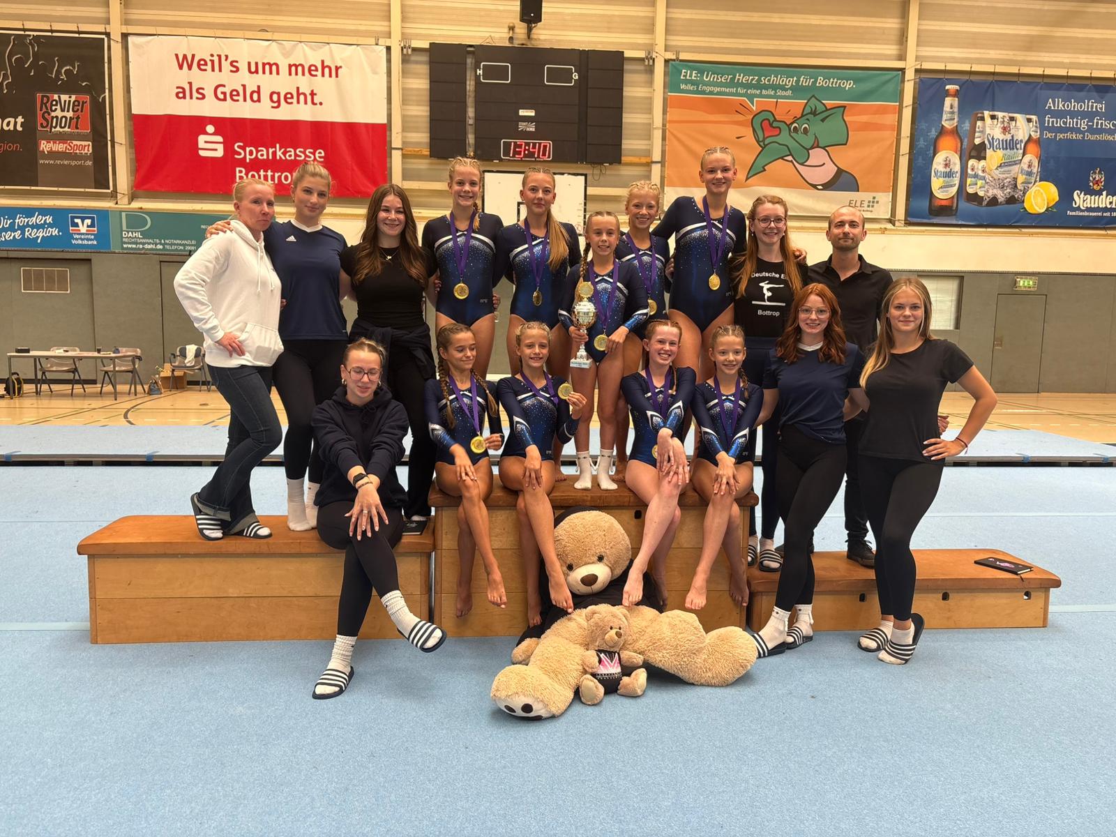 Am Sonntag gingen 5 Mannschaften aus Bottrop in allen Altersklassen an den Start. Jede Mannschaft muss ihr Können unter Beweis stellen und sich Platz 1 oder 2 sichern, um sich in die Gaugruppe zu qualifizieren. Die jüngsten Turnerinnen im Jahrgang 2017 erreichten Platz 2. Die Mannschaft im Jahrgang 2014-2016 landete ebenfalls auf dem zweiten Platz. Die 3 älteren Mannschaften in den Jahrgängen 2012-2013, 2011-2010 und 2009 und älter haben eine hervorragende Leistung gezeigt und gewannen den Wettkampf für sich. Für den TV Deutsche Eiche Bottrop heißt dies, dass sich alle fünf Mannschaften für die Gaugruppe am 15. und 16. November qualifiziert haben.